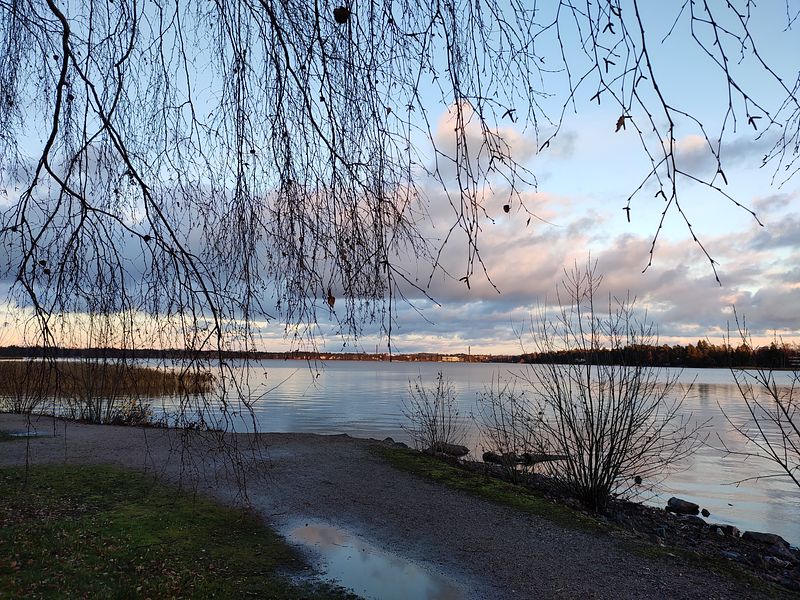 A serene sunset by the lakeside, framed by the delicate branches of willows swaying in the gentle breeze, that invites tranquility and peace | Espoo, Finland, 2021